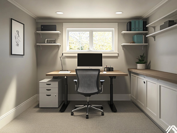 A functional basement office requires strategic layout planning: